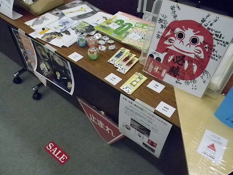 野田哲也さんは、NICe東海ブースを出展。シルクスクリーン印刷で、願掛け&願いが成就した際には好みのデザインを貼れる目玉ステッカー付きオリジナル自社商品「必勝だるま色紙」をはじめ、NICe東海のメンバーたちから預かった「アニマルしおり」や東山動植物園カレンダー、ひとつひとつ手づくりの「オカザえもん」おちょこなど、仲間の力作を率先して紹介&販売した