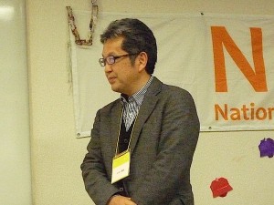 ▲東京都から参加の榎本雅章さん。ベビーアートインストラクター協会、講師養成事業をご紹介