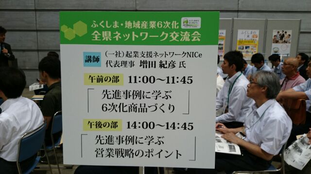 2014年9月18日(木)、福島県郡山市のビッグパレットふくしまにて、福島県、東邦銀行、JA全農福島、農林中金福島支店の4者初合同主催による「ふくしまから はじめよう。食の商談会 ふくしまフードフェア2014」が開催され、過去最大規模の商談会となった。NICeの増田紀彦代表が午前では、「先進事例に学ぶ 6次化の商品づくり」、午後には「先進事例に学ぶ 営業連略」と題し、2回にわたってステージで講演。また場内には171社・団体が出展し、国内外から仕入れ担当者(バイヤー)や飲食店オーナー、シェフらが多数来場した。ふくしま・地域産業6次化推進協議会のブースでは、さる9月4日、NICeプロデュース ふくしま“食”プロジェクトの商品化 第1回会議で好評だった(参照レポート