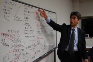 「ツイッターやフェイスブックでオヤジギャクを飛ばして、記憶にとどめてもらおうと頑張っています」と自己紹介した渕本議員は、旧朝来町4町の合併時に貢献し、地域のためにとの強い思いから2003年に市会議員選に立候補したという。そして、朝来市については、観光資源の多さ、町づくりのトップランナーであること、イメージ的に山だらけをプラスに展開していきたい、と3項目に付いて話したいと述べた。